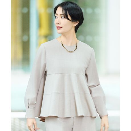 フレア部分に切り替えが入ったデザインのペプラムブラウス■デザイン胸下の切り替えから裾にかけてフレアに広がるペプラムが特徴の長袖ブラウスです。フレア部分に切り替えを入れることで、甘い印象になりすぎないようにデザインしています。少しボリュームのあるお袖なので、上からジレを羽織ったり、中にインナーをレイヤードした着こなしもできるようになっています。■素材ウールの糸にストレッチ性のあるポリエステル糸を混紡しているサキソニー素材です。サキソニーならではのウォーム感と柔らかさ、コシのある風合いが特徴です。洗えて、シワが気になりにくいイージーケアウール素材です。■同素材アイテムワイドパンツ(PRW7LS0004)