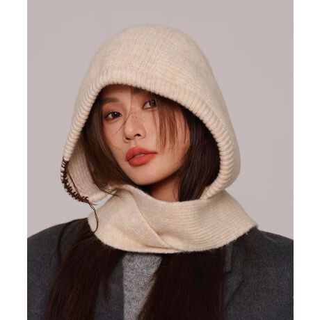 冬の防寒アイテムとして人気の高いバラクラバをアレンジした、帽子とマフラーが一体化したデザインのフードウォーマー。