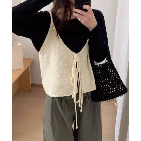 シンプルながらも女性らしいシルエットを引き立ててくれる、リボン付きのニットキャミソール。