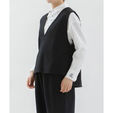 ウール100%の圧縮ニット天竺のベスト。ふんわり軽くてやわらかく暖かく、カジュアルに着られるのにきちんと感をプラスできるアイテムです。深めのVネックデザインで後ろ下りのシルエット。両サイドにスリットあり。