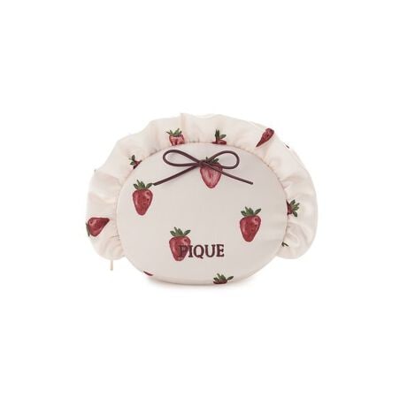 可憐なフリルを周りにあしらった、サテン素材のストロベリー柄ミニポーチ。同時時に展開するストロベリー柄ルームウェアと同じ、ジューシーな質感のいちごプリントが入っています。配色のリボンとロゴ刺繍を添えたキャッチーなデザイン。リップやヘアクリップ、イヤホンなどちょっとした小物の収納に重宝するサイズ感です。同シリーズのミニバッグやルームウェアと組み合わせてお楽しみください。