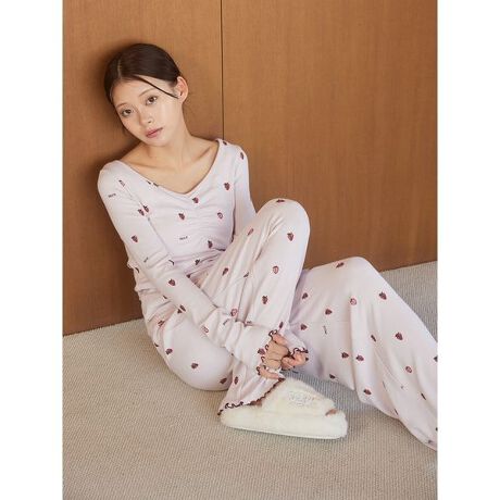 小さないちご柄が大人にさりげなく響く、柔らかなリブカットソーのロングT。保温性のあるHOT FABRICで、寒さが厳しくなる季節にも心地よく着られる1枚です。配色メローがさりげないアクセントに。カラーは大人かわいいピンクとシックなネイビーの2色展開。同シリーズのロングパンツと合わせたコーディネートもおすすめです。
