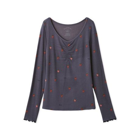 小さないちご柄が大人にさりげなく響く、柔らかなリブカットソーのロングT。保温性のあるHOT FABRICで、寒さが厳しくなる季節にも心地よく着られる1枚です。配色メローがさりげないアクセントに。カラーは大人かわいいピンクとシックなネイビーの2色展開。同シリーズのロングパンツと合わせたコーディネートもおすすめです。