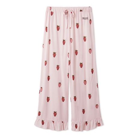 じゅわっとした果肉感をリアルに描いたストロベリー柄が、大人っぽいムードを演出するロングパンツ。裾には大きめフリルをあしらったフェミニンなデザインでさりげなく華やかさをプラス。左腰にはPIQUEのロゴ刺繍をあしらい、さりげないアクセントに。カラーは大人の女性に似合う優しいピンクと落ち着いたネイビーの2色展開。同シリーズのシャツや小物と合わせて、大人かわいいコーディネートをお楽しみいただけます。