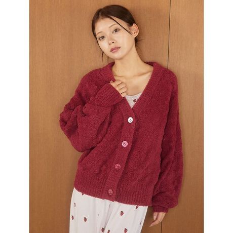 熟れたいちごのようにジューシーなレッドが温もりを届けてくれる、柄編みのカーディガンです。袖ぐりを広くとったざっくりしたシルエットと、いちごのような凹凸感のある柄編みがキュートな存在感。同時期に展開するストロベリー柄のシリーズと合わせてお楽しみください。