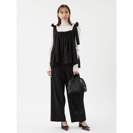 華やかで着映えするリボンディティールのキャミブラウスと、ウエストゴムのキレイめワイドパンツ、2枚がSETになったうれしいアイテムです。