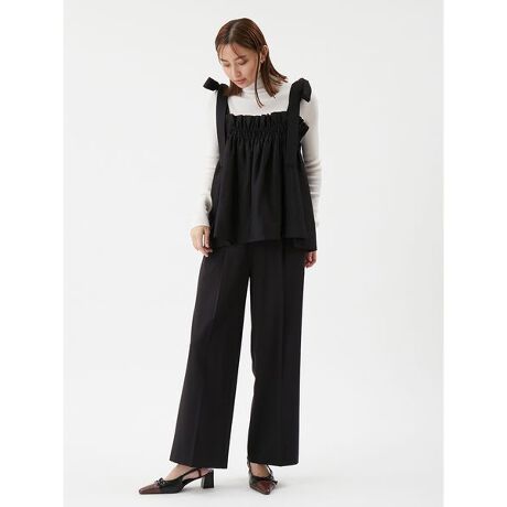 華やかで着映えするリボンディティールのキャミブラウスと、ウエストゴムのキレイめワイドパンツ、2枚がSETになったうれしいアイテムです。