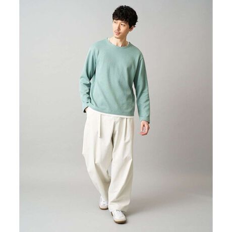 アウターやカーディガンのインナーにも着用しやすい、程よくゆとりのあるセミワイドシルエット。