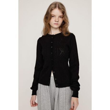 【HEART CROCHET KNIT TOPS】■POINT:ハートや複数の柄を組み合わせオリジナルで作成したクロシェ編みニットカーディガン。コンパクトなシルエットと軽やかな印象の編み地で、1枚で羽織りとしてもトップスとしても活躍します。フロントのハートモチーフのボタンはホリデームードを高める1着です。■DETAIL:毛羽立ちの少ないコットンナイロンの素材で、軽やかさと程よいハリ感を兼ね備えた着心地の良いアイテムです。ニット端はレースのように波打ったスカラップ仕様でガーリーな印象をプラスさせるさり気ないポイント。デイリーに使用しやすいアイボリー・グレー・ブラックに加えて、シーズンムードを感じさせるレッドの4色展開です。■STYLING:デニムやスウェットパンツと合わせてカジュアルダウンさせるのはもちろん、ミニスカートやワンピースなどと合わせたフェミニンなスタイリングまで幅広いコーディネートと相性抜群です。フロントのボタンを閉じて1枚でトップスとしてはもちろん、アウターのインナーとして使用するのもおすすめです。■FABRIC/MATERIAL:軽やかながら程よいハリ感のあるコットンナイロン混のニットを使用。[注意事項]※画像の商品はサンプルです。実際の商品と仕様、加工が若干異なる場合があります。※画像の商品は光の照射や角度、お使いのモニター環境により、実物と色味が異なる場合がございます。※着用、お取り扱いの際は、アテンションタグをご確認ください。※一部予約商品につきましては生産上の都合によりお届け予定日や店頭発売と前後する場合もございます。※追加生産商品は、一部の店舗、通販で販売中の場合がございます。予めご了承下さい。