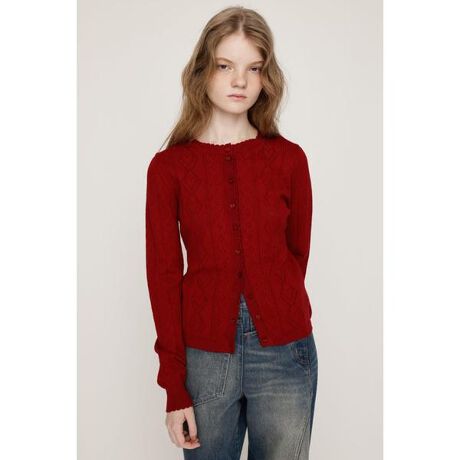 【HEART CROCHET KNIT TOPS】■POINT:ハートや複数の柄を組み合わせオリジナルで作成したクロシェ編みニットカーディガン。コンパクトなシルエットと軽やかな印象の編み地で、1枚で羽織りとしてもトップスとしても活躍します。フロントのハートモチーフのボタンはホリデームードを高める1着です。■DETAIL:毛羽立ちの少ないコットンナイロンの素材で、軽やかさと程よいハリ感を兼ね備えた着心地の良いアイテムです。ニット端はレースのように波打ったスカラップ仕様でガーリーな印象をプラスさせるさり気ないポイント。デイリーに使用しやすいアイボリー・グレー・ブラックに加えて、シーズンムードを感じさせるレッドの4色展開です。■STYLING:デニムやスウェットパンツと合わせてカジュアルダウンさせるのはもちろん、ミニスカートやワンピースなどと合わせたフェミニンなスタイリングまで幅広いコーディネートと相性抜群です。フロントのボタンを閉じて1枚でトップスとしてはもちろん、アウターのインナーとして使用するのもおすすめです。■FABRIC/MATERIAL:軽やかながら程よいハリ感のあるコットンナイロン混のニットを使用。[注意事項]※画像の商品はサンプルです。実際の商品と仕様、加工が若干異なる場合があります。※画像の商品は光の照射や角度、お使いのモニター環境により、実物と色味が異なる場合がございます。※着用、お取り扱いの際は、アテンションタグをご確認ください。※一部予約商品につきましては生産上の都合によりお届け予定日や店頭発売と前後する場合もございます。※追加生産商品は、一部の店舗、通販で販売中の場合がございます。予めご了承下さい。