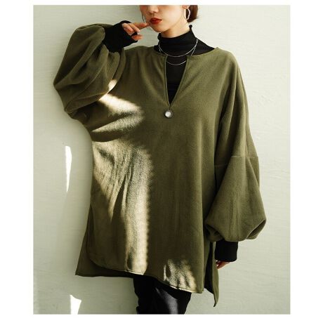 【チュニック】 プルオーバー ランタンスリーブ 長袖 キーネック フリース スリット カーキ 秋 冬