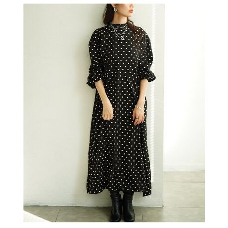 マルイウェブチャネル   /   サワアラモード   /   ワンピースドレス   /   ワンピース   /   【ワンピース】 ドット モックネック ボリューム袖 フレア 長袖 ロング バックファスナー ブラック