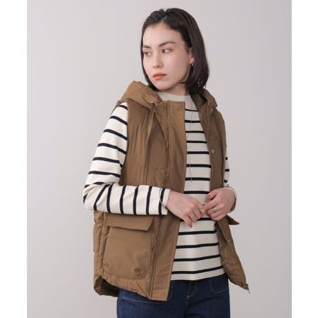 軽やかな着心地が魅力の中綿フードベスト。 程よいボリューム感で着膨れせず、さっと羽織るだけで季節感のあるスタイリングが完成します。フード付きデザインがカジュアルになりすぎず、コーデに程よい抜け感をプラス。 ヒップにかかる安心丈で体型カバーも叶えつつ、パンツにもスカートにも合わせやすい万能アイテム。アームホールにゆとりがあり、厚手トップスの上からでもストレスフリーな着用感です。 季節の変わり目から真冬のレイヤードまで、長く活躍する一着です。