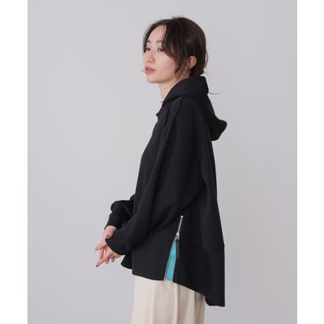 コクーンフォルムが特徴的なフーディダンボールプルオーバー。サイドZIPがアクセント。