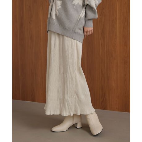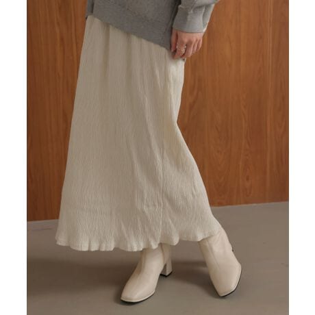 縦に流れるクラッシュ加工が、動くたびにさりげない表情を生む一枚。立体感のある畝が体のラインを拾いすぎず、すっと縦を強調してくれるので、ナローでも気負わず着こなせます。後ろスリット入りで足さばきが良く、女性らしさの中に軽やかな抜け感をプラス。ウエストは総ゴム仕様で、きれい見えしながらリラックスしたはき心地も魅力です。