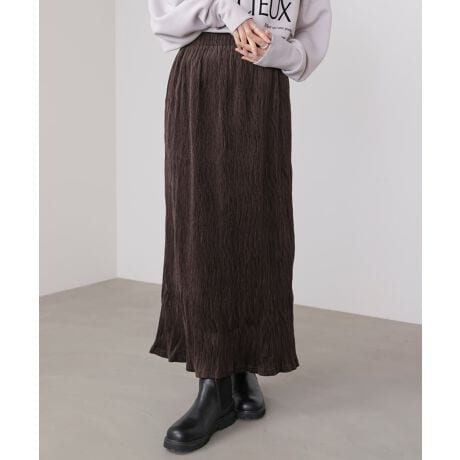 縦に流れるクラッシュ加工が、動くたびにさりげない表情を生む一枚。立体感のある畝が体のラインを拾いすぎず、すっと縦を強調してくれるので、ナローでも気負わず着こなせます。後ろスリット入りで足さばきが良く、女性らしさの中に軽やかな抜け感をプラス。ウエストは総ゴム仕様で、きれい見えしながらリラックスしたはき心地も魅力です。