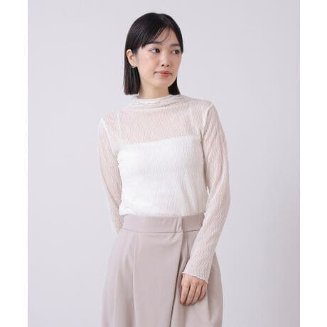 繊細な幾何学柄レースが、スタイリングにさりげない華やかさを添えるタートルトップス。 透け感のある素材が女性らしく、重ね着しても軽やかな印象に仕上がります。 程よくフィットするシルエットで、ジャケットやジャンスカ、ニットのインナーとしても活躍。首元は締めつけ感の少ないタートル仕様で、上品さと着心地を両立しています。 一枚で着ても、レイヤードのアクセントとしても使える、大人のための万能レースアイテムです。