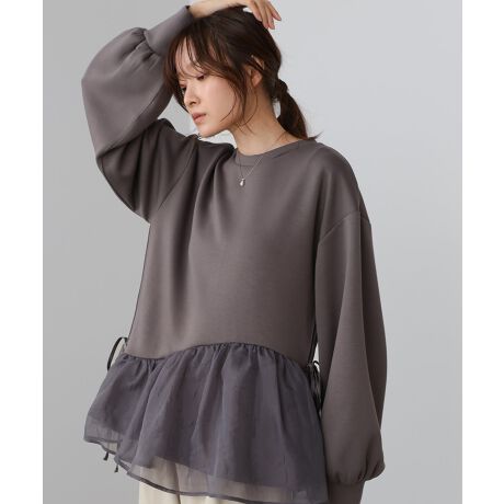 ペプラムの切り替えからシアー素材を重ね、動くたびにふわっと遊びがあるデザインが軽やかなトップスの登場です。気軽にお召し頂ける嬉しいポンチ素材で、柔らかい着心地も特徴です。サイドのリボンとボリューム感のある袖が可愛らしいアクセントになります。