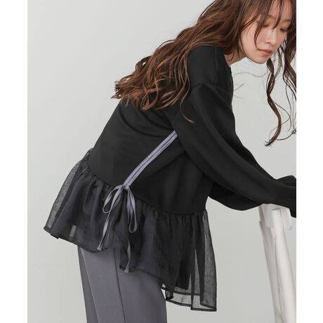ペプラムの切り替えからシアー素材を重ね、動くたびにふわっと遊びがあるデザインが軽やかなトップスの登場です。気軽にお召し頂ける嬉しいポンチ素材で、柔らかい着心地も特徴です。サイドのリボンとボリューム感のある袖が可愛らしいアクセントになります。