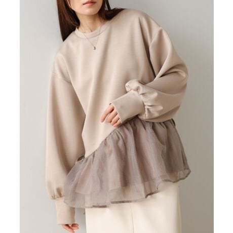 ペプラムの切り替えからシアー素材を重ね、動くたびにふわっと遊びがあるデザインが軽やかなトップスの登場です。気軽にお召し頂ける嬉しいポンチ素材で、柔らかい着心地も特徴です。サイドのリボンとボリューム感のある袖が可愛らしいアクセントになります。