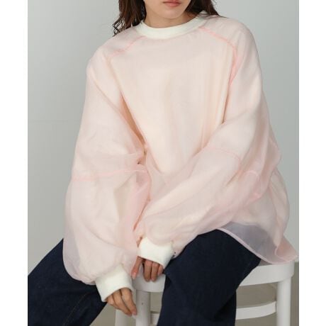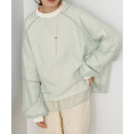 イージーな着心地の裏毛スウェットにオーガンジーをレイヤードして着映え抜群の1枚が出来上がりました!オーガンジー部分は光の当たり具合で様々な表情が浮かび上がります。ラグランスリーブの程よくルーズなシルエットがこなれ感を演出し、袖もぱふっと感があり 可愛らしいボリューム感でフェミニンさを引き立てます。バランスの取りやすい腰までのレングスも魅力的です。