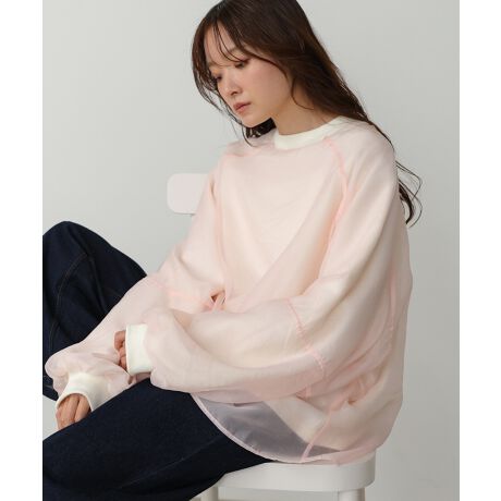 イージーな着心地の裏毛スウェットにオーガンジーをレイヤードして着映え抜群の1枚が出来上がりました!オーガンジー部分は光の当たり具合で様々な表情が浮かび上がります。ラグランスリーブの程よくルーズなシルエットがこなれ感を演出し、袖もぱふっと感があり 可愛らしいボリューム感でフェミニンさを引き立てます。バランスの取りやすい腰までのレングスも魅力的です。