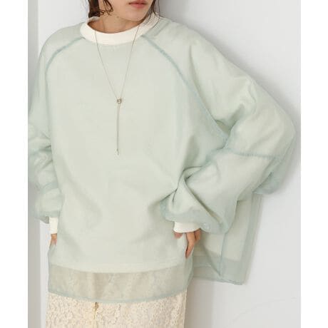 イージーな着心地の裏毛スウェットにオーガンジーをレイヤードして着映え抜群の1枚が出来上がりました!オーガンジー部分は光の当たり具合で様々な表情が浮かび上がります。ラグランスリーブの程よくルーズなシルエットがこなれ感を演出し、袖もぱふっと感があり 可愛らしいボリューム感でフェミニンさを引き立てます。バランスの取りやすい腰までのレングスも魅力的です。