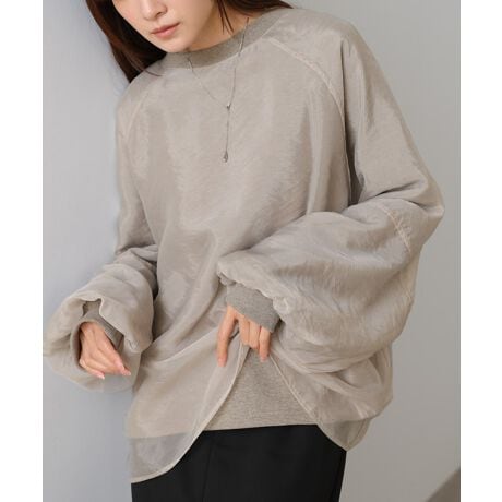 イージーな着心地の裏毛スウェットにオーガンジーをレイヤードして着映え抜群の1枚が出来上がりました!オーガンジー部分は光の当たり具合で様々な表情が浮かび上がります。ラグランスリーブの程よくルーズなシルエットがこなれ感を演出し、袖もぱふっと感があり 可愛らしいボリューム感でフェミニンさを引き立てます。バランスの取りやすい腰までのレングスも魅力的です。