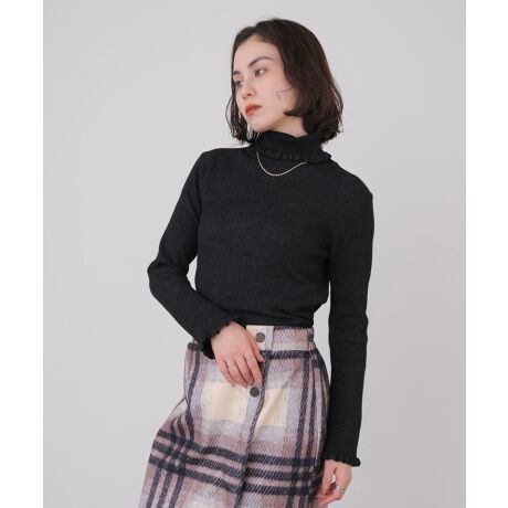 首元と袖口にさりげなくあしらったフリルが、女性らしい柔らかさを演出するリブニットタートル。