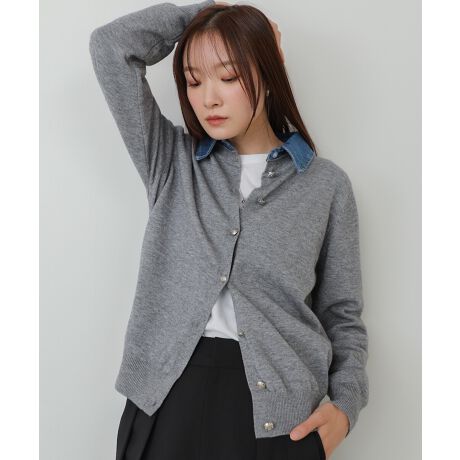 デニム衿をポイントにした、旬のムード漂うドッキングデザインのニットカーディガン。衿のカジュアルさと、シルバーボタンの上品さが絶妙に調和し、1枚できれいめカジュアルが完成します。もちもちとした柔らかなニットが、着心地のよさと女性らしい雰囲気を両立。シンプルなシルエットながら、衿の存在感がスタイリングをぐっとこなれた印象に見せてくれる主役級アイテムです。アイボリー・グレー・ネイビーの3色展開で、どれもコーデに取り入れやすい落ち着いたカラーになっています。