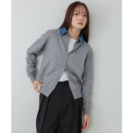 デニム衿をポイントにした、旬のムード漂うドッキングデザインのニットカーディガン。衿のカジュアルさと、シルバーボタンの上品さが絶妙に調和し、1枚できれいめカジュアルが完成します。もちもちとした柔らかなニットが、着心地のよさと女性らしい雰囲気を両立。シンプルなシルエットながら、衿の存在感がスタイリングをぐっとこなれた印象に見せてくれる主役級アイテムです。アイボリー・グレー・ネイビーの3色展開で、どれもコーデに取り入れやすい落ち着いたカラーになっています。