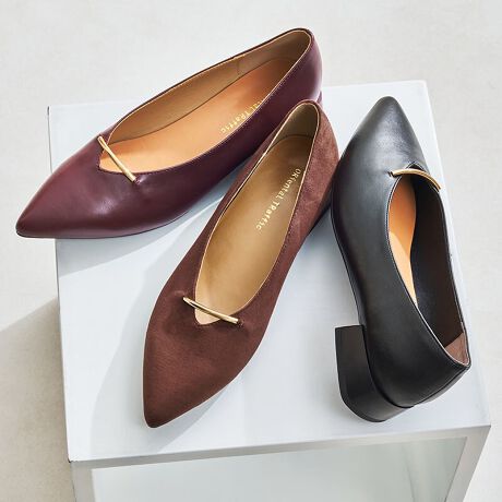 アッパーに施したゴールドラインと、ポインテッドトゥが女性らしさを引き立ててくれ、