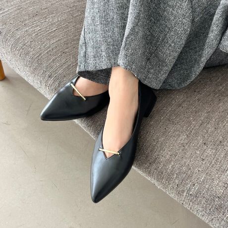 アッパーに施したゴールドラインと、ポインテッドトゥが女性らしさを引き立ててくれ、
