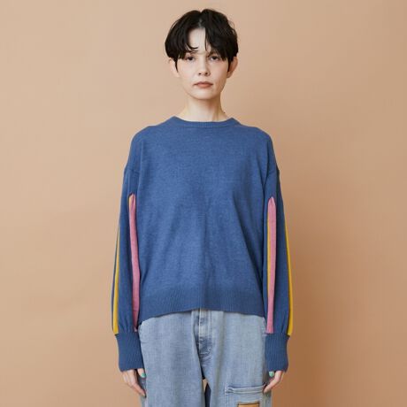 【素材】肌触りの良さと程よいしなやかさが特徴の糸を使ったデザインニット。【デザイン】スッキリとした身頃にカラフルな配色のボリューム袖がシンプルな中にもさり気ないアクセントを作っています。袖部分は膨らみが有りながらも糸自体の持つしなやかさで大人っぽい上品な膨らみに仕上がっています。絶妙な配色もポイントになっています。【ブランド情報】FRAPBOIS/フラボア2001年にブランドスタート。「大人げない大人の服」をコンセプトに、大人が着るリラックスしたデイリーウェアを提案するコレクションブランド。レディースとメンズのアイテムをご用意しています。https://frapbois.jp