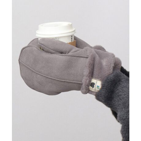 指先をすっぽり覆うことも、少し出して使うことも可能な2WAYタイプのフェイクムートンミトングローブ。ハリネズミのブランドタグがワンポイントに。