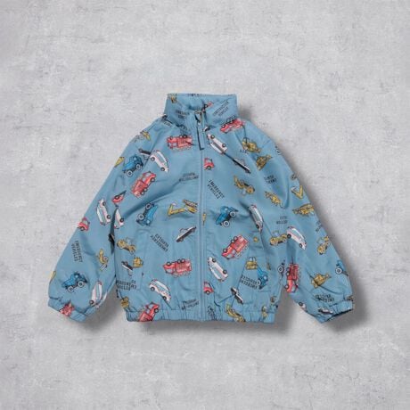 子どもたちに大人気!はたらく車をちりばめた総柄デザインが楽しいフリースの裏地付きのジャケットです。