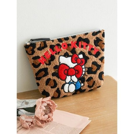 [型番:25570360058]もこもこのヒョウ柄デザインがおしゃれなハローキティのポーチ。背面は異なる生地を使用しているので、表情の変化を楽しめます。中身を整理できる内ポケット付きがポイント。休日のお出かけや旅行シーンにも大活躍してくれるアイテムです。