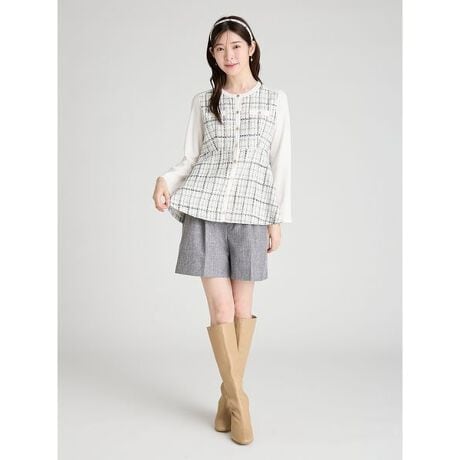 ツイード素材とニットをドッキングしたペプラムカーディガン。