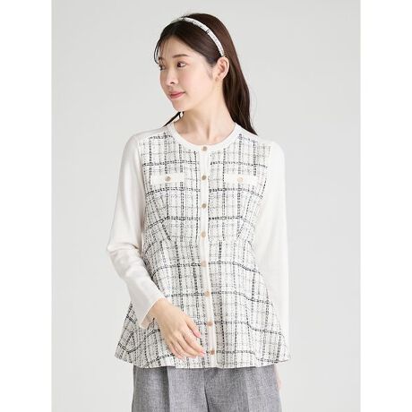 ツイード素材とニットをドッキングしたペプラムカーディガン。