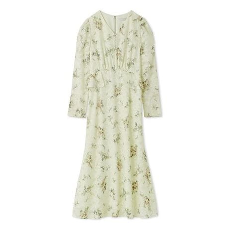 程よい透け感のある柔らかなカットジャガード生地に、抽象的なタッチと淡い色彩のトーンで仕上げたオリジナルの花柄をプリントしたワンピース。