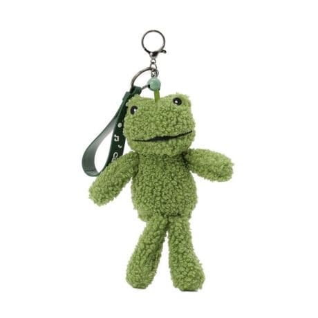 起毛感のある素材でラバーのストラップが付いたカエルのチャームになります。
