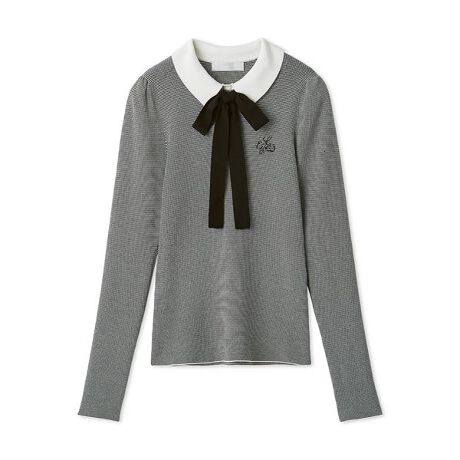 衿付きニットプルオーバーは、通常よりも衿腰を高くすることで、リボンを付けた際にも綺麗に収まるパターンにこだわった1着。左胸には同色の光沢糸でカリグラフィーロゴ刺繍をワンポイントで入れました。
