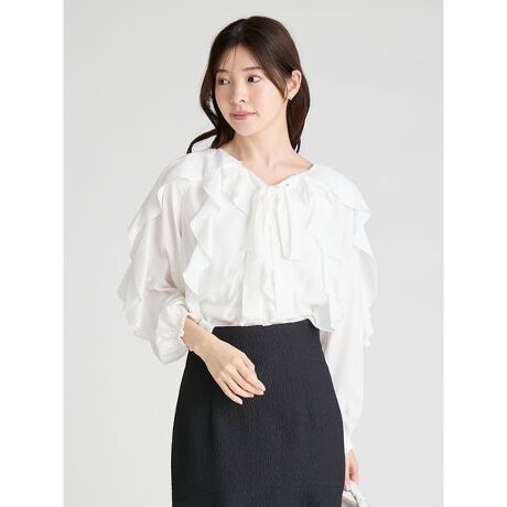 光を柔らかく反射する微光沢のブラウス地で、軽やかなラッフルフリルを贅沢にあしらった一枚。衿元のリボンは顔まわりを華やかに演出し、着こなしに品の良いアクセントを添えます。MIXは繊細な草花のスケッチ風モチーフに、さりげないレタリングを組み合わせた柄のプリントで、衿元のリボンを配色の黒にすることで知的な印象にまとめました。前後2WAY仕様で、バックリボンとしても楽しめるデザインは、シーンや気分に合わせたアレンジが可能。動くたびに表情を変えるフリルの立体感が、装いに軽やかなリズムをもたらします。少し長めの着丈は、パンツともスカートとも好相性で、インでもアウトでも美しく決まります。