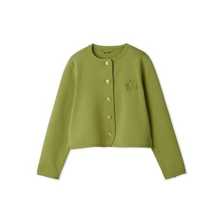 左胸にコード刺繍という手法で施したカリグラフィー調のブランドロゴとメタル釦がポイントのニットカーディガン。