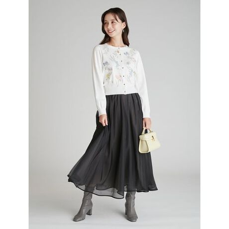 繊細な透け感をまとうシフォンジーと、ラメチュールの重なりが生み出す、奥行きのある色彩が魅力のシアータックフレアスカート。光を受けてしなやかに揺れるたびに、気持ちまで華やぐような印象的な足元を演出します。裾にはクラシカルなムードを添えるグログランストレッチテープをあしらい、さりげないアクセントに。ウエストのゴム仕様にはジグザグステッチを施し、クラフト感を添えました。シンプルなトップスとも好相性で、日常に品のある華やかさをもたらす一着です。