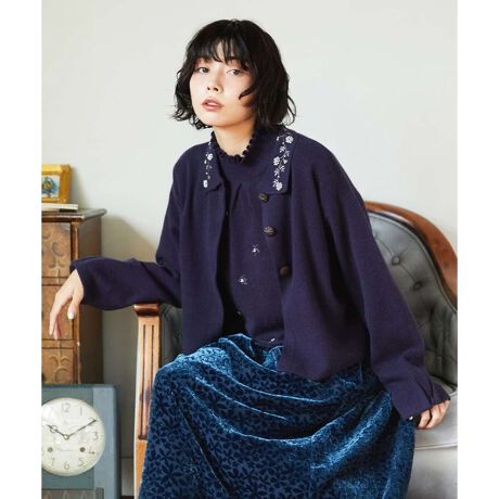 上品ながらも大人かわいい印象のニットカーディガン。ゆったりした身幅とドロップショルダーのシルエットは、袖が通しやすくレイヤードスタイルにも最適です。袖口のタックで丸みを持たせたデザインがフェミニンな印象を後押し。襟には刺繍×パールビーズの小振りなお花モチーフで華やかさプラスしました。総針編みでしっかりした編地もポイントです。