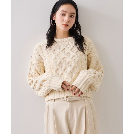 編み柄の異なるケーブルを組み合わせた、表情豊かなニットプルオーバー。