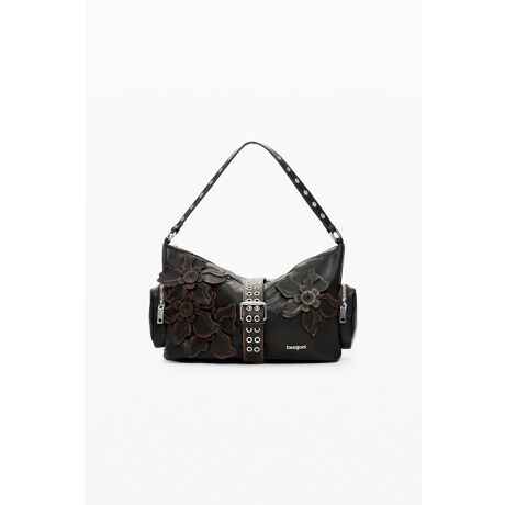 交換可能なストラップ、花の装飾、装飾的なバックル付きストラップ、金属製ロゴが付いた中型バッグ。