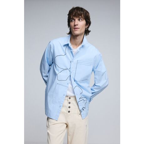 無地の背景に異なるモチーフのステッチと刺繍が施された長袖シャツ。