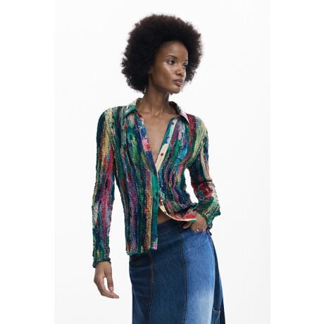 リサイクルポリエステル生地で作られた長袖シャツで、衣服全体にカラフルなプリントが施されています。シャツカラーと前面のボタン留めが特徴です。